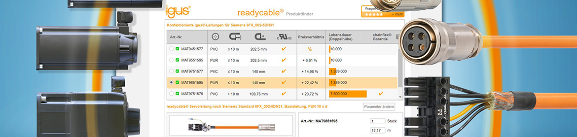 Der readycable® Produktfinder mit direkter Lebensdauerberechnung der ausgewählten Antriebsleitungen: