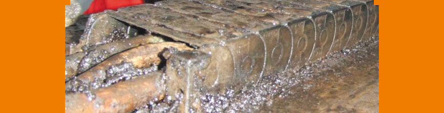Ein Asphaltfinisher bringt heiße und kalte Bitumenmischungen auf. Die e-kette® versorgt den vorderen Fahrzeugbereich und ist stärksten Verschmutzungen ausgesetzt.