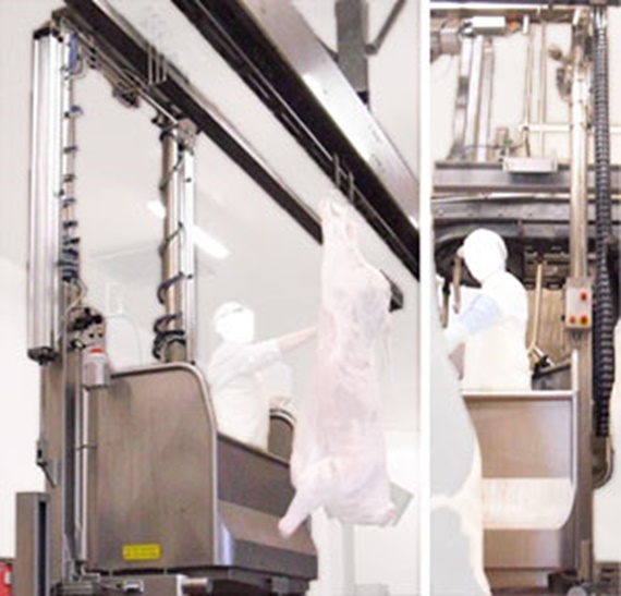In diesem Schlachtbetrieb in Frankreich werden Hebebühnen eingesetzt, mit denen die Mitarbeiter vertikal am Fleisch arbeiten können. Das Heben und Senken der Bühne erleichtert das Schneiden und das Etikettieren des Fleisches.