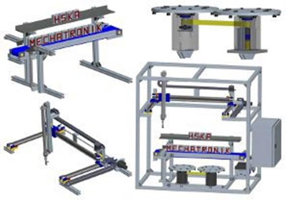 Zu Präsentationszwecken sind in die Objekte Buchstaben eingefräst. Somit lässt sich auf dem Ablageblech und dem Förderband der Schriftzug des Studiengangs „HSKA Mechatronik“ darstellen.