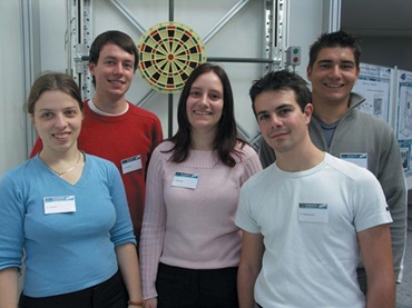 Tag der Offenen Tür an der TU München: Ingenieurstudenten vor der von ihnen entwickelten "Treffsicheren Dartscheibe". Auch auf den Fachmessen Vision (Stuttgart) und PS/IPC/Drives (Nürnberg) wurde die Erfindung präsentiert.