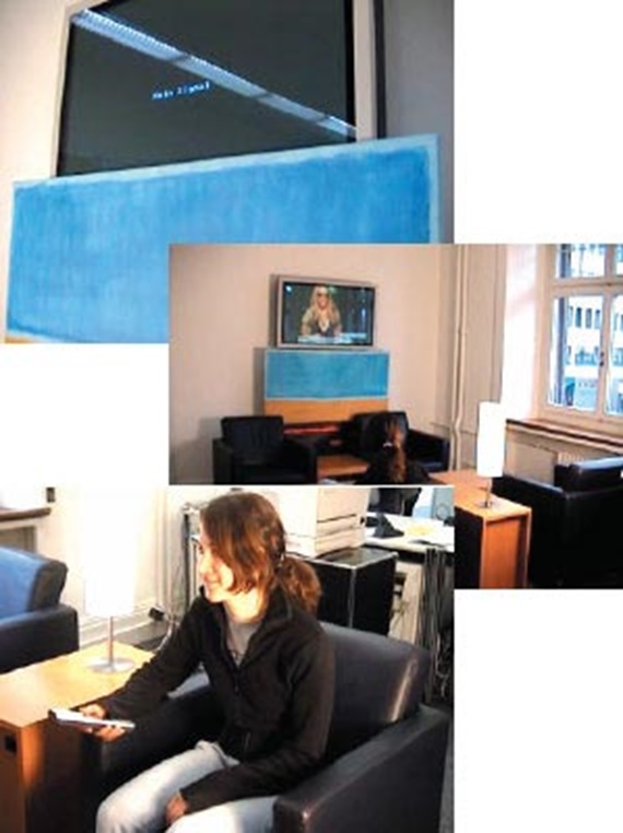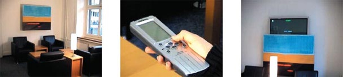 Das Bild hängt vor dem Fernseher. Wenn dieser gebraucht wird, lässt sich das Bild einfach herunterfahren und gibt den Blick frei.