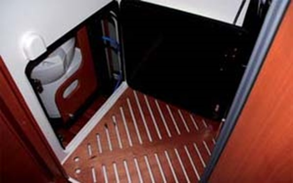 Bei der Ausstattung von Wohnmobilen zählt jeder Quadratzentimeter. Hier wurden Sanitärelemente in der Nasszelle mit igus®-Produkten verbaut. Das Waschbecken wurde verschiebbar im Bad angeordnet. Eine drylin® Doppelschiene führt die Bewegung. Die Toilette lässt sich in der Wand der Nasszelle verstauen. Für eine wartungsfreie Drehung der Toilette wurden eine drylin® Präzisionswelle aus Aluminium und die passenden iglidur® Gleitlager verwendet.