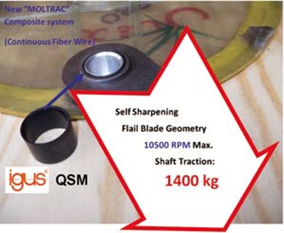 Gleitlager aus iglidur® Q verbinden die Trägerund die Klingenwelle der Mähscheibe. Mit einer Zugkraft von bis zu 1400 Kilogramm sorgen sie dafür, dass die Klingendrehung sich dem Ausgleich zwischen Zentrifugalkraft und dem Schnittwiderstand anpasst und sich sogar komplett um die Achse drehen kann, wenn der Anstoß besonders hart ist.