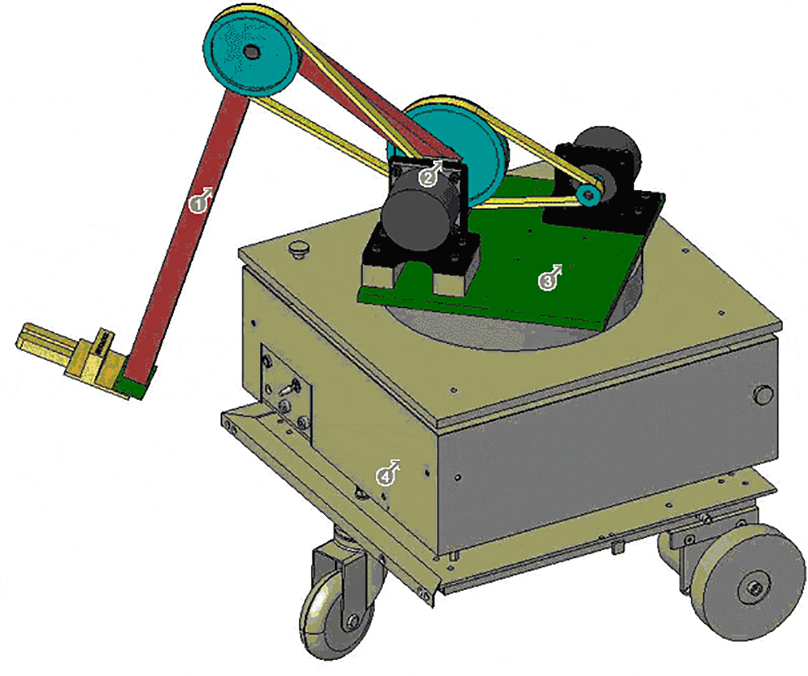 Schwerpunkt der Aufgabenstellung für den Greifarm waren einfache Verfahrbewegungen, leichte Bauweise sowie ein möglichst großer Aktionsradius. Der Aktionsradius wird durch zwei bewegliche Arme, die auf einer drehbaren Grundplatte angebracht sind, erreicht. Angetrieben werden sie durch Schrittmotoren, die auf der Gehäuseoberseite des Roboters befestigt sind.