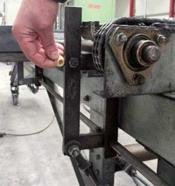 Die Verschachtelungsmaschine ist in drei Schichten an fünf Tagen in der Woche bei einem Ausstoß von 20 Profilen pro Minute im Einsatz. Alle Profile bestehen aus verzinktem Stahlblech, die vor Ort gefertigt und zu Lagereinheiten zusammengefasst werden. Die Einsatzbedingungen für die Polymerlager sind entsprechend schwierig. In der Verschachtelungsanlage für die Profile kommen für die Führungsbewegung auf der Förderstrecke Zweiloch-Flanschlager zum Einsatz. Sie sind vorrangig für die Lagerung von Wellenenden oder Wellendurchführungen entwickelt worden. Wie alle „igubal®“-Produkte bestehen sie aus einem schlagfesten Gehäuse aus „igumid G“ und einer Kalotte aus „iglidur® J“ oder aus „iglidur® W300“, abhängig von der Maßreihe. Dieser Lagerwerkstoff zeichnet sich durch niedrige Reibwerte im Trockenlauf sowie eine geringe Stick-Slip-Neigung aus. Je nach Bauart sind die Flanschlager für die Befestigung mit zwei oder vier Schrauben ausgelegt. Ein exaktes Ausrichten der Lagergehäuse ist nicht erforderlich, da das Flanschlager Fluchtungsfehler selbstständig ausgleicht.
