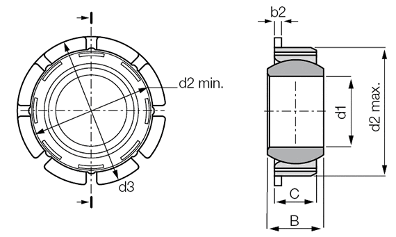 | Order no. | d1 | d2 min. | d2 max. | d3 | C | B | b2 | Housing min. | Housing max. | Max. pivot angle |