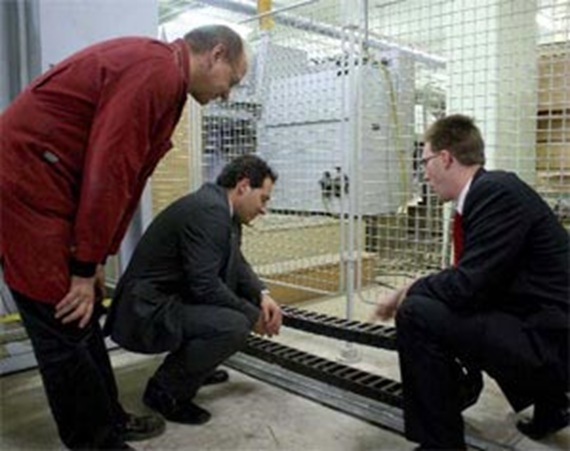 von links: Johann Doler, Bereichsleiter Technik bei ADA, mit den beiden igus®-Mitarbeitern Gerald Weber und Hans-Jürgen Schram beim Inspizieren einer Energiekette.