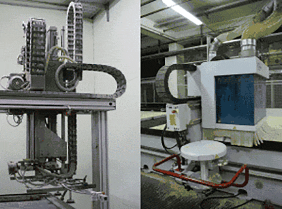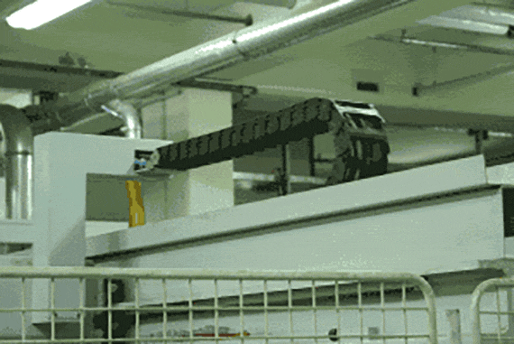 Möbelfabrik ADA-Möbelfabrik, Baierdorf: Überall wo Leitungen, wie bei diesem Abstaplerautomaten, permanent in Bewegung sind, werden sie nach dem ersten Leitungsbruch gegen „chainflex®“-Leitungen CF5/CF6 von igus® ausgetauscht.
