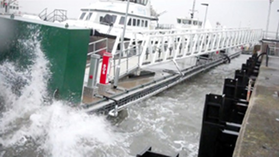 An diesem Ponton im britischen Barrow-in-Furness werden die Service-Boote eines Windparkbetreibers fit für den Einsatz gemacht. Hierfür werden Dieselleitungen sowie Schläuche und Kabel für Lenzpumpen von Land auf die Pontons geführt. Damit diese in der rauen Umgebung zuverlässig vor Beschädigungen geschützt sind, wurde eine 20 Meter lange e-kette® der Serie 1640 von igus® verwendet. Die führt sogar die 100 Millimeter starken Kraftstoffleitungen sicher ans Ziel und ist völlig unempfindlich gegen salzige Luft und raue See.