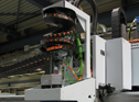 Die Produktionsmaschine sägt, fräst und stanzt Aluminiumbleche.