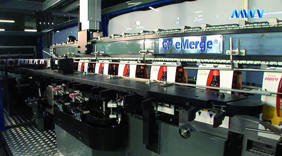 Diese Verpackungsmaschine kann einzelne Flaschen in der Packung automatisch in die gewünschte Position drehen.